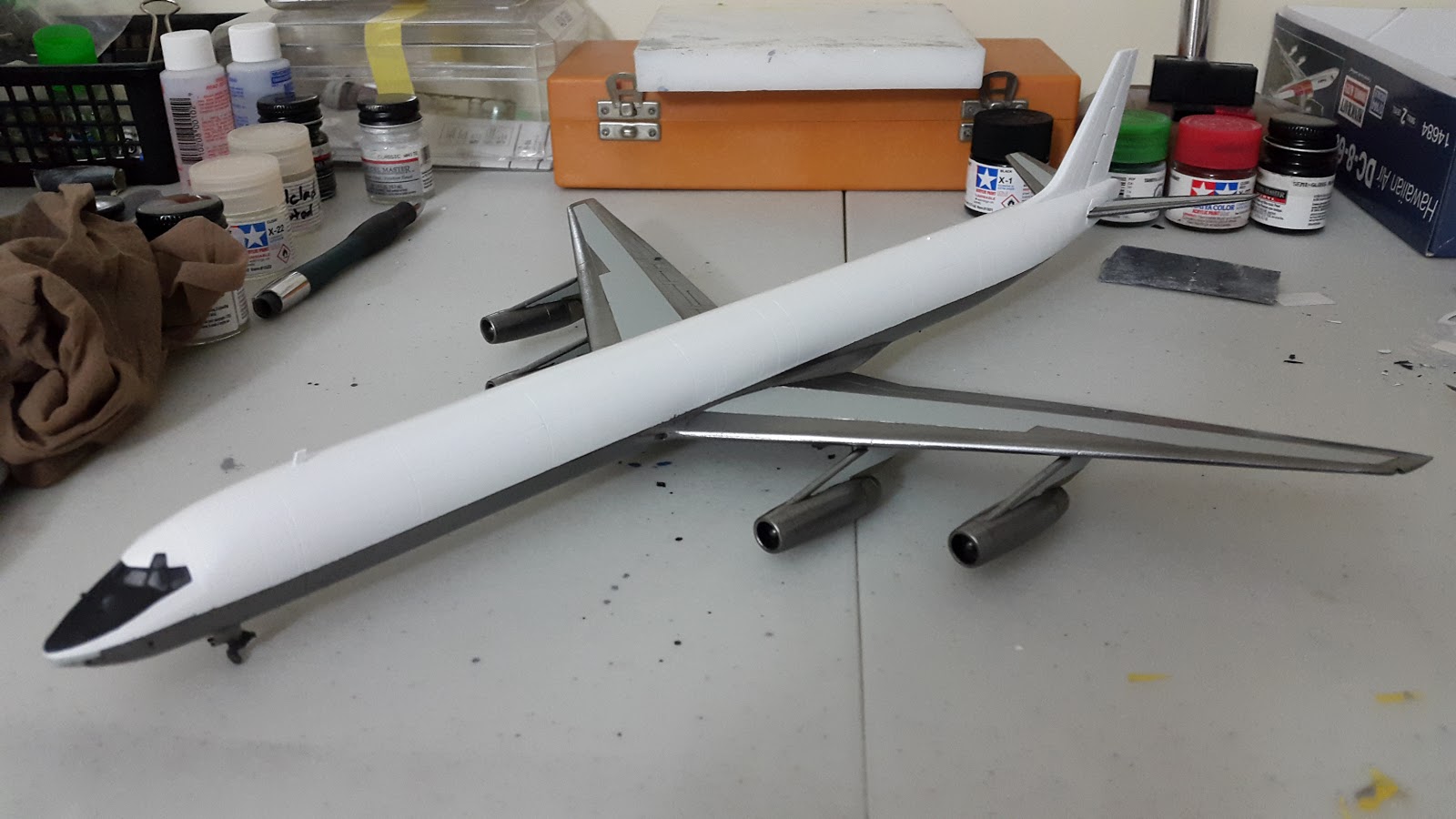 The beginning of decaling. At this stage, the upper and under side of the wings have been completed and the cheatline along with the windows was added. Just the tail logo and lettering are missing.